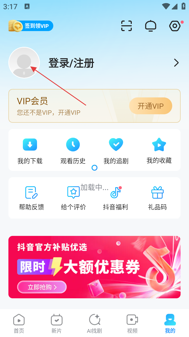 2、进入“我的”页面后,点击【登录/注册】选项,进入登录注册界面。