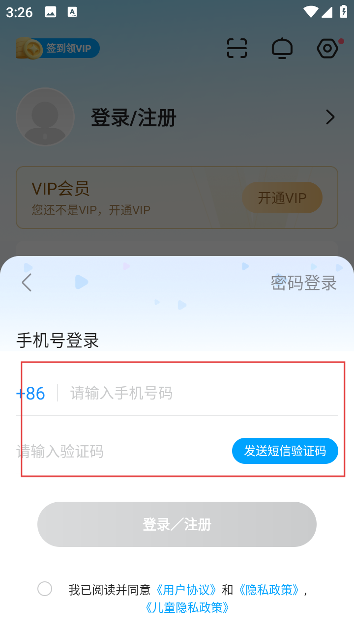 3、在登录注册界面,选择手机号登录,输入手机号码,点击【发送短信验证码】。