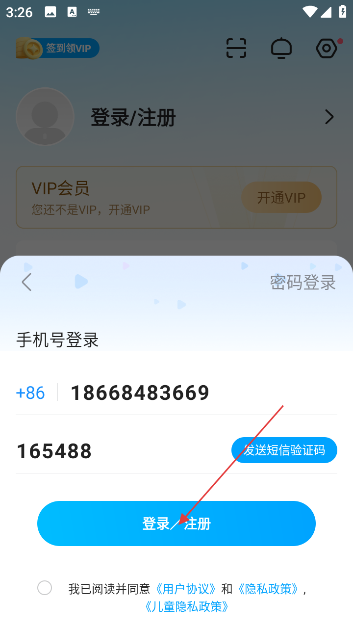 4、输入收到的验证码后,点击【登录/注册】按钮,即可完成登录或注册操作。