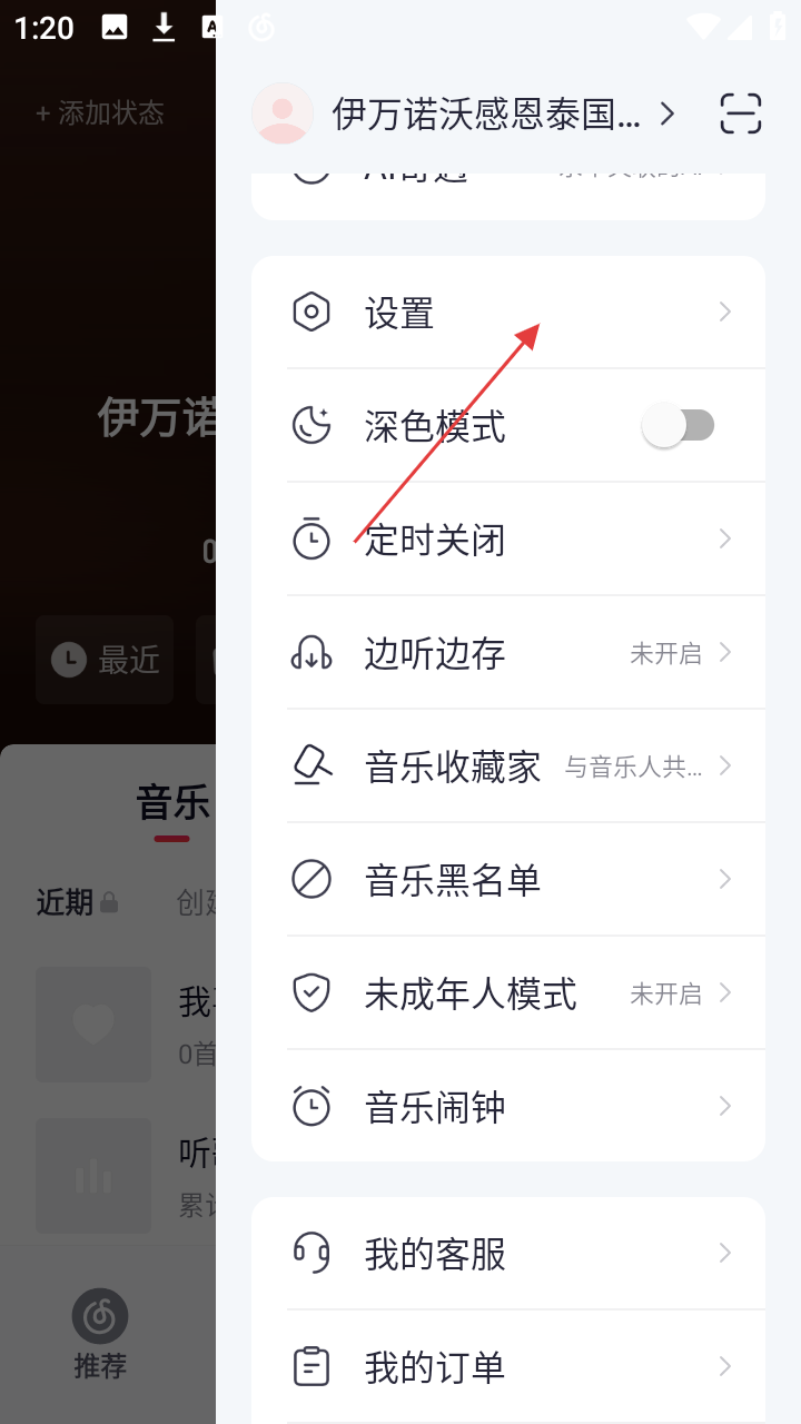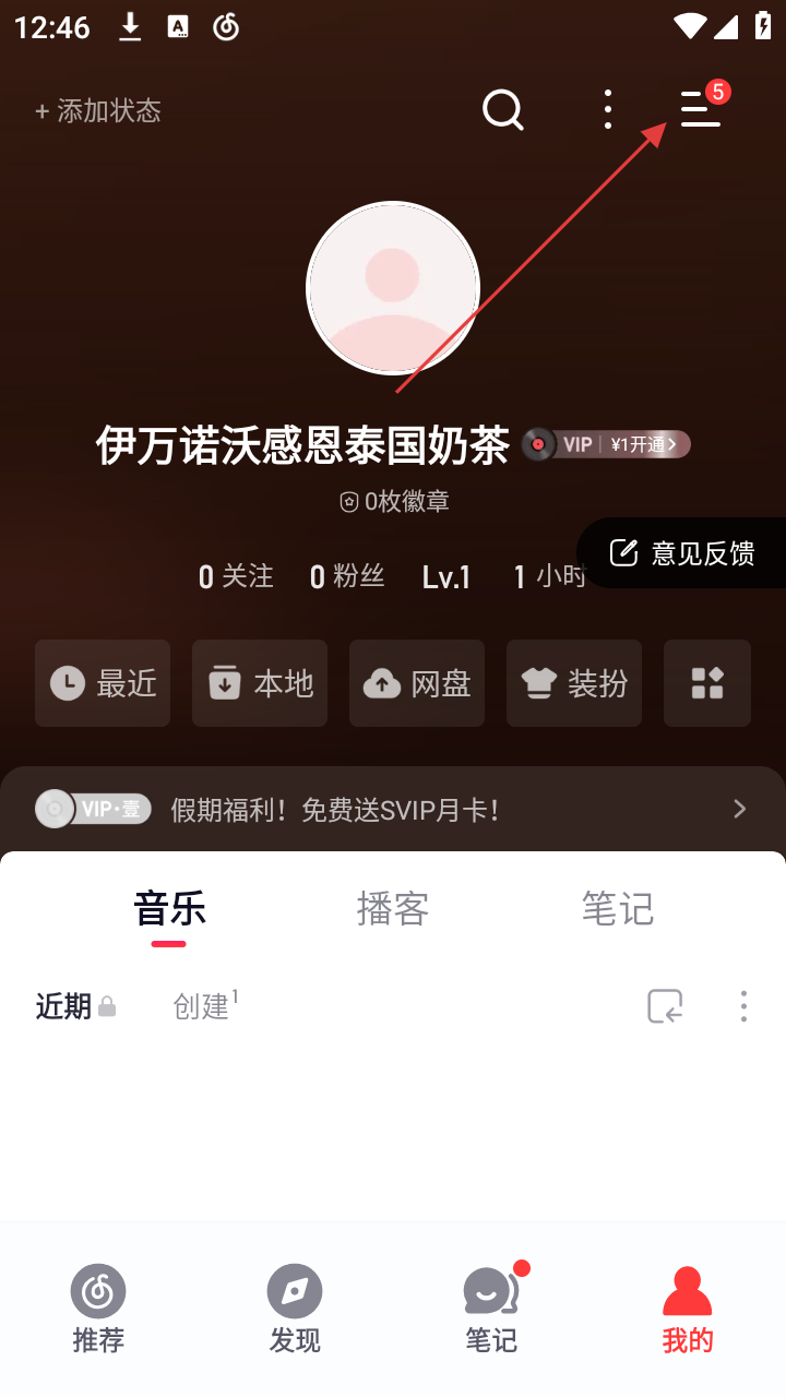 1、在网易云音乐“我的”页面,能看到用户信息及功能入口,点击右上角菜单图标,可展开更多选项。