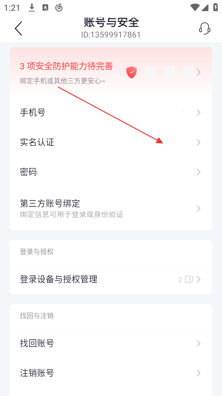 3、进入设置里的“账号与安全”页面,能看到有3项安全防护能力待完善,还有手机号、实名认证等选项。