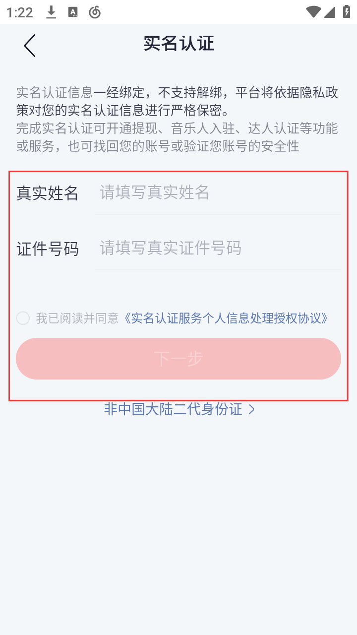 4、点击“实名认证”,进入对应页面,需填写真实姓名、证件号码,阅读并同意协议后,可进行下一步操作。