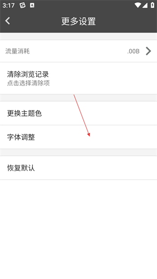 3、进入【更多设置】界面后,找到【字体调整】选项,点击可选择喜欢的浏览器字体大小。