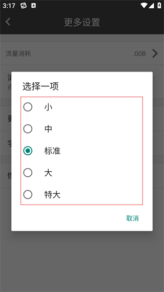 4、在字体大小选择界面,可选择【小】【中】【标准】等字体大小,优化浏览器文字显示效果。