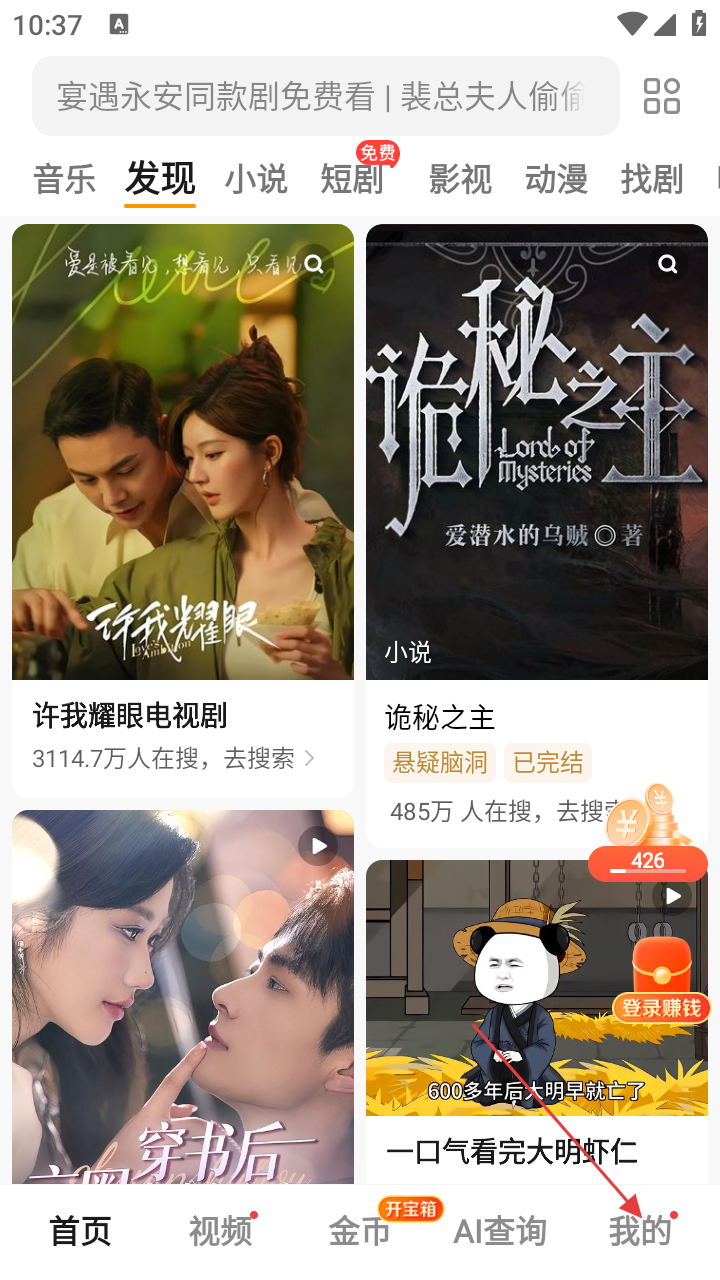 1、在悟空浏览器首页,点击底部【我的】,进入个人页面,可查看历史、收藏等内容。