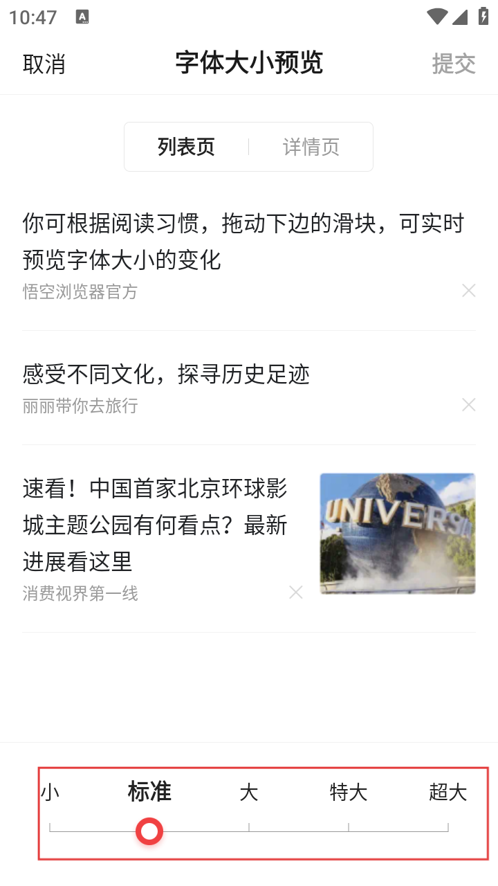 4、在字体大小预览页面,拖动滑块选择合适字体大小,选好后点击【提交】,完成字体设置。