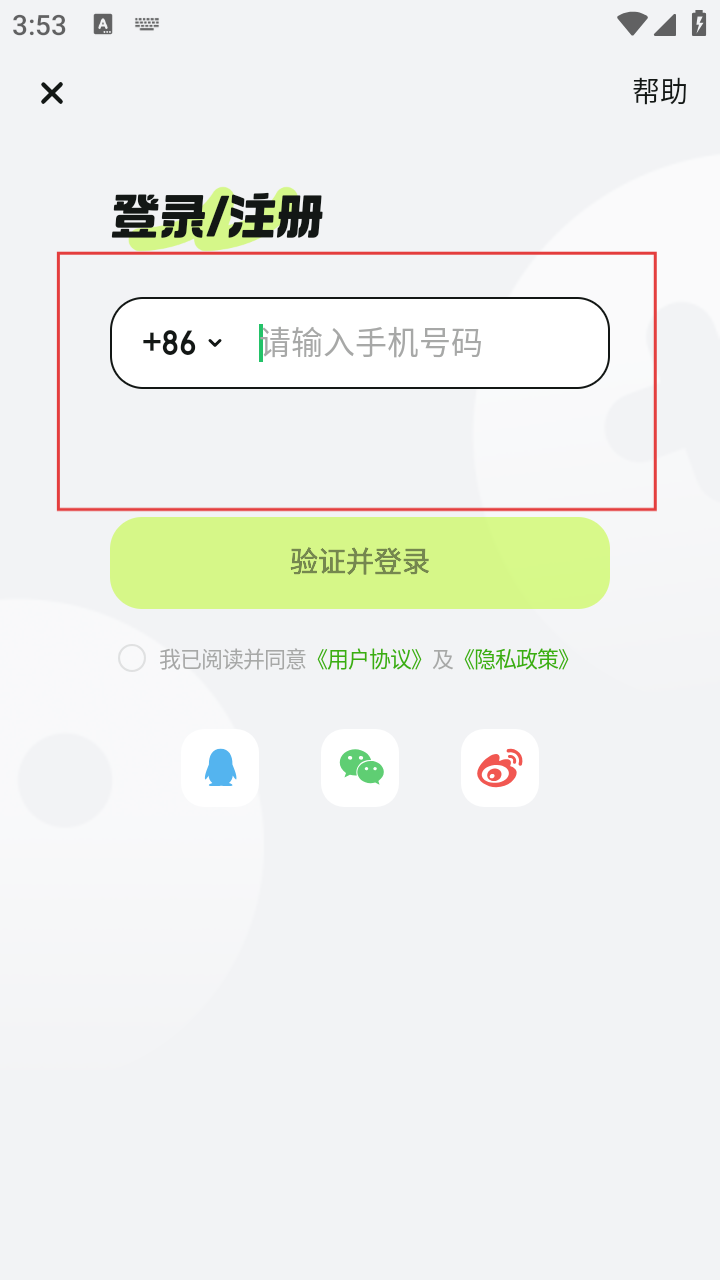 3、进入登录/注册页面,在手机号输入框中输入手机号码,为后续登录做准备。