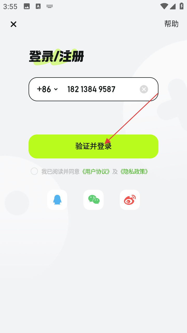 4、输入好手机号码后,勾选同意《用户协议》及《隐私政策》,点击【验证并登录】按钮,进行登录操作。