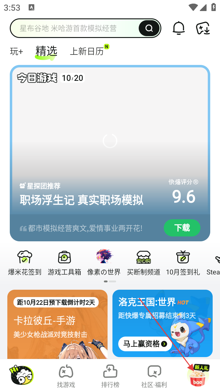 1、在好游快爆主界面,若要进入个人相关页面,点击右下角标有【新人礼】的爆米花图标。