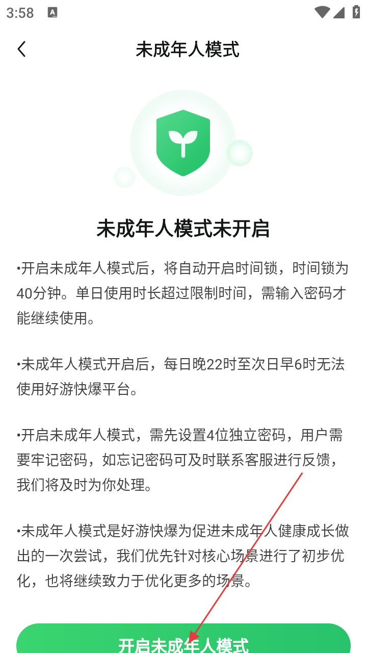 4、进入未成年人模式页面,若要开启该模式,点击底部的【开启未成年人模式】按钮。