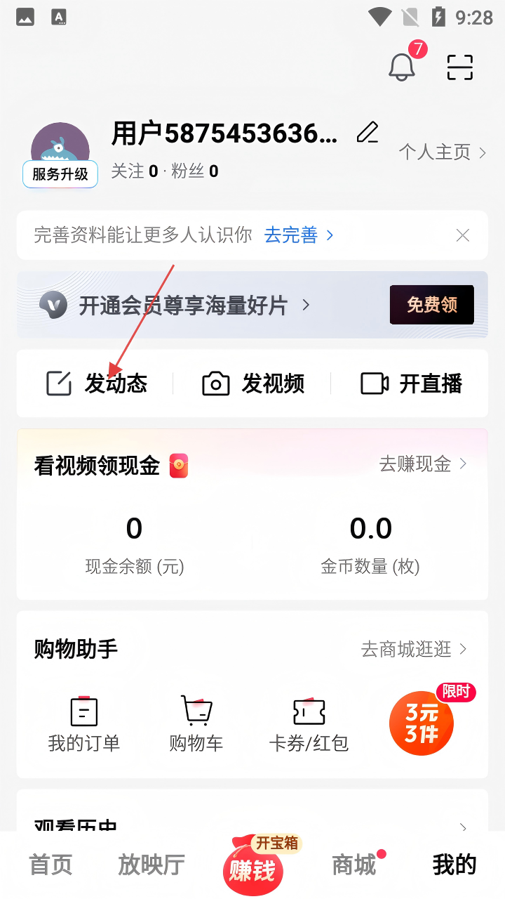 2、在个人页面中,点击【发动态】选项,进入发动态编辑页面。