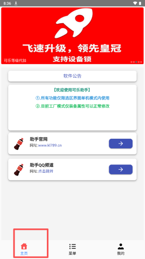 1、打开可乐助手应用,进入主页,查看公告和功能选项。